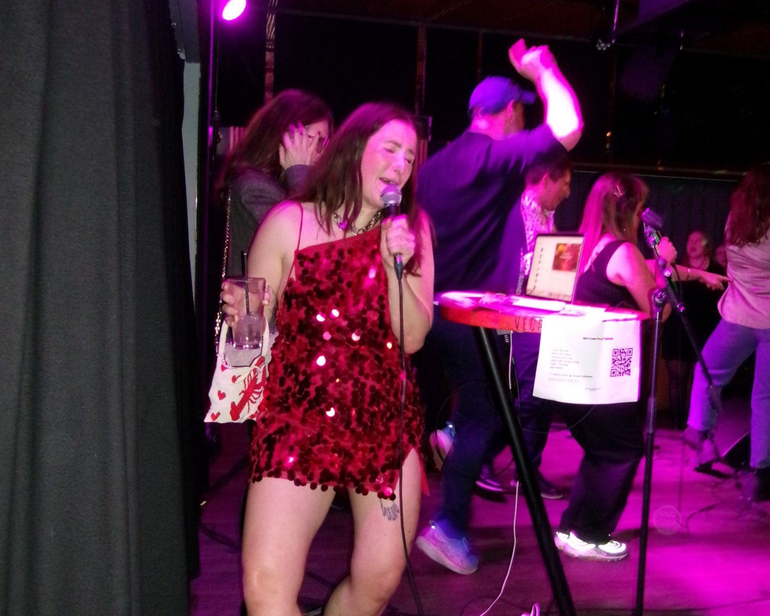 Register your song via QR code. Wait til you're called up to the stage. Shine bright like a diamond singing your banger of choice and get the endorphins from everyone singing along. Bow. Choose a new song. And repeat.